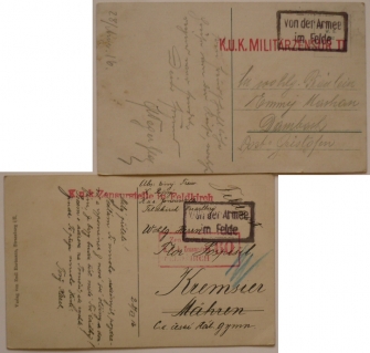 sestava 2 pohlednic s rámečkovými razítky "Von der Armee im Felde", razítka cenzury; hezké