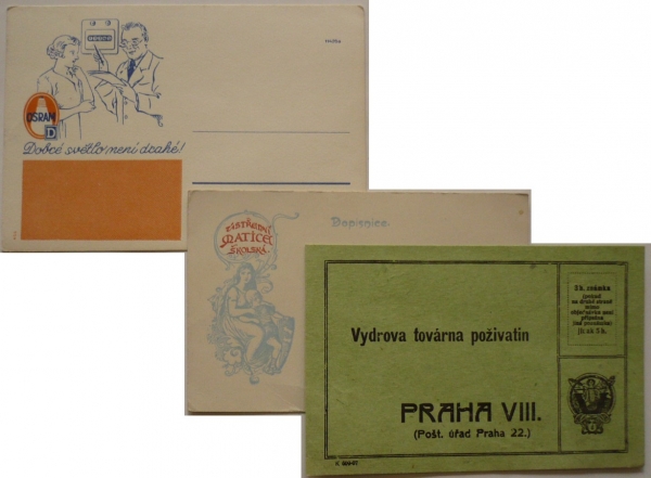 sestava 3 nepoužitých korespondenčních lístků s reklamními přítisky