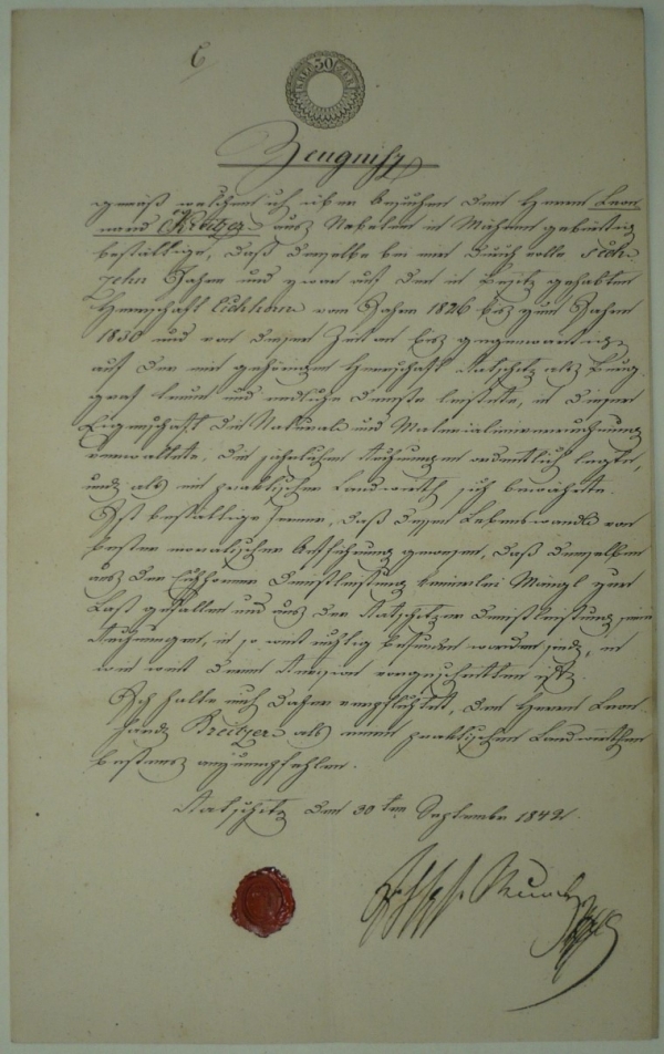 vysvědčení se šlechtickou pečetí, v záhlaví kolek, červená pečeť; bezvadné