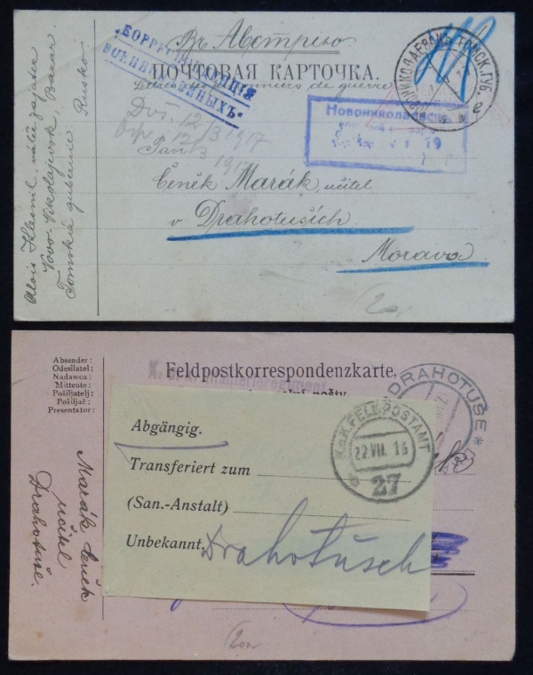 sestava 2 celistvostí, 1x lístek polní pošty, nedoručeno, přilepen úřední lístek, 1x ze zajetí NOVONIKOLAJEVSK; zajímavé