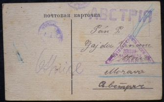 korespondenční lístek z Ruska na Moravu, razítko ruské a rakouské cenzury, zachovalé