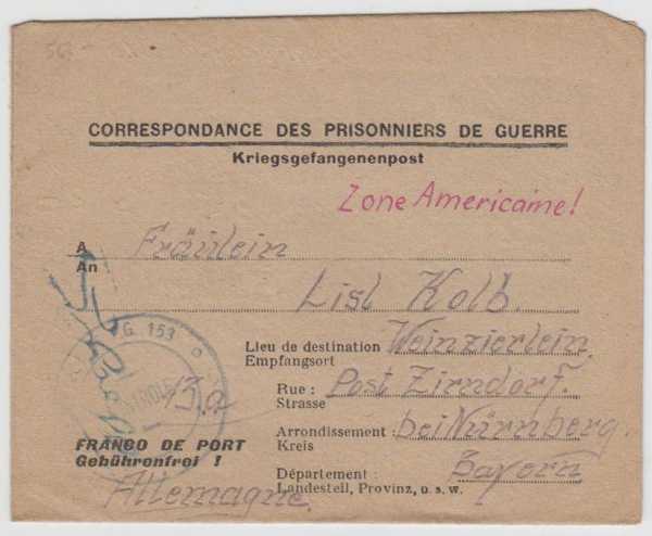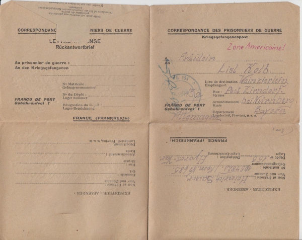 Zajatecká pošta, předtištěná zálepka z Francie do Americké zóny