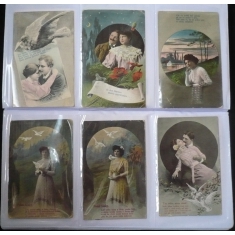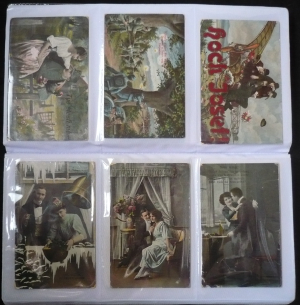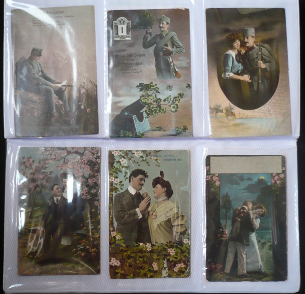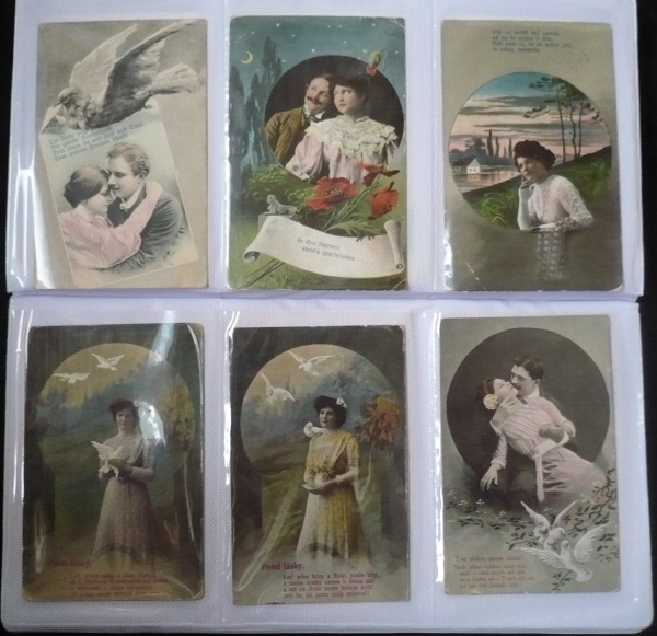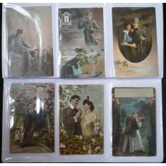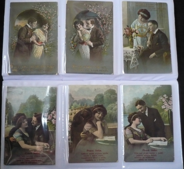 sbírka 100 kusů pohlednic s námětem zamilovaných dvojic, odloučených vojáků a podobně; uloženo v lesklém zásobníku; standardní kvalita