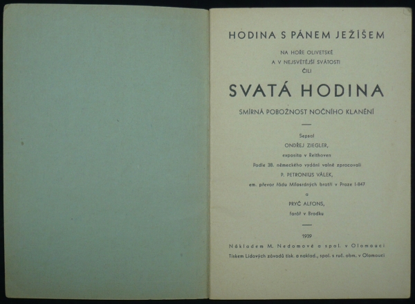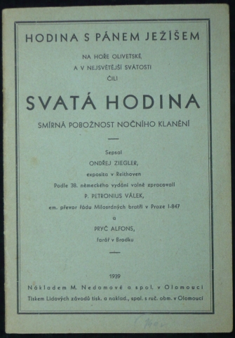 Hodina s Pánem Ježíšem na Hoře Olivetské a v Nejsvětější Svátosti čili Svatá hodina: Smírná pobožnost nočního klanění, autoři Ondřej Ziegler, Alfons Pryč, Petronius Válek, vydavatel M. Nedomová a spol., počet stran: 39; bezvadné