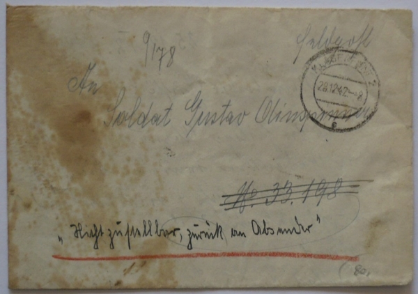 adresováno na FP 33.198, vráceno zpět, KLAGENFURT 28.12.42; skvrna