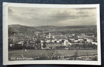 fotopohlednice, pohled na Baťovy závody, prošlá, stržená známka, Q2