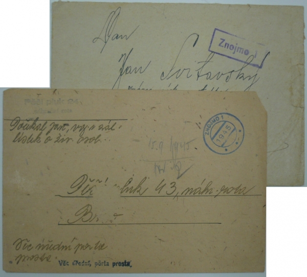 sestava 2 dopisů s provizorními razítky, 1x s útvarovým razítkem Pěší pluk 24/ náhradní rota; horší stav, otřepy v okraji a odstraněná klopa