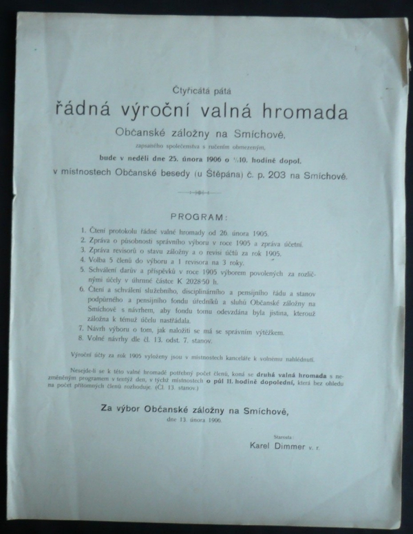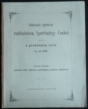 Česká spořitelna, zpráva o hospodaření za rok 1903, 48 stran, k tomu program výroční valné hromady Občanské záložny na Smíchově v roce 1906; zachovalé