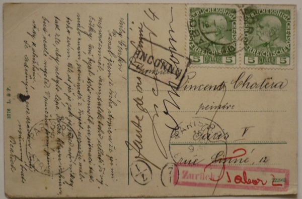 pohlednice do Pařiže, TÁBOR 12.I.11, adresát nezastižen, vráceno zpět, hezká pohlednice