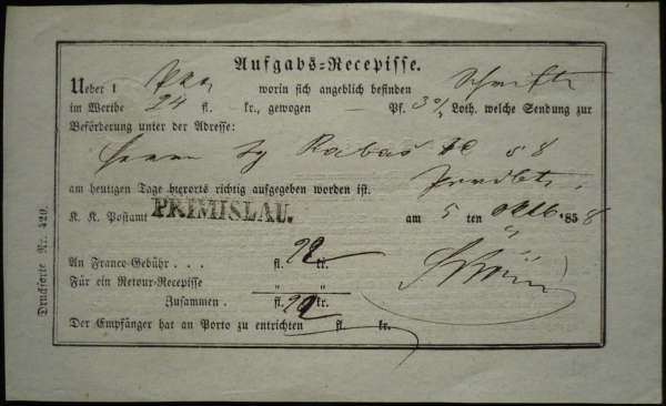 1858 Podací lístek PRIMISLAU [Přibyslav]