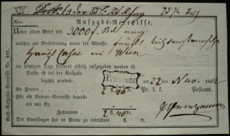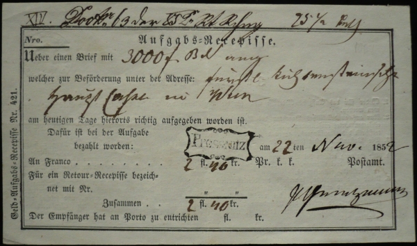 1852 Podací lístek PROSSNITZ [Prostějov]